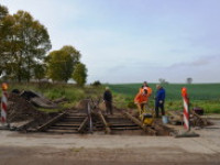 Am 11. Oktober begannen unter Mithilfe einiger Mitglieder des Fördervereins die Arbeiten zur Wiederherrichtung des Bahnübergangs in Damme. Zuerst wurde die etwa 20cm dicke Asphaltdecke mit unserem museumseigenen Bagger T174 abgetragen. Erst jetzt konnte man sich ein vollständiges Bild von der Lage verschaffen. Einige Schwellen sind doch noch brauchbar und können dort verbleiben. Leider wurden aber beim damaligen „Überbauen“ auch […]