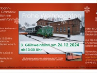 Sehr geehrte Damen und Herren, am 26.12.2024 findet im Eisenbahnmuseum Gramzow die 3. Glühweinfahrt statt. Die Karten für die Glühweinfahrt müssen vorbestellt werden, und sind nach Möglichkeit im Vorverkauf zu erwerben. (weitere Informationen unter der Tel./Fax: 039861/70159, E-Mail: eisenbahnmuseum-gramzow@freenet.de)